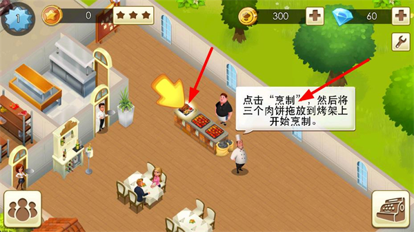 1、按照提示點擊烹制,將肉餅拖放到烤架開始烹制,啟動菜品制作流程,推進餐廳的餐食供應進程。