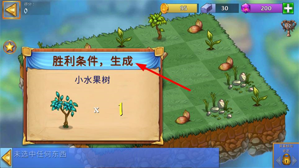 4、進入新關卡會出現勝利條件提示,要求生成小水果樹,按照提示準備對應植物,開啟新的合成任務。