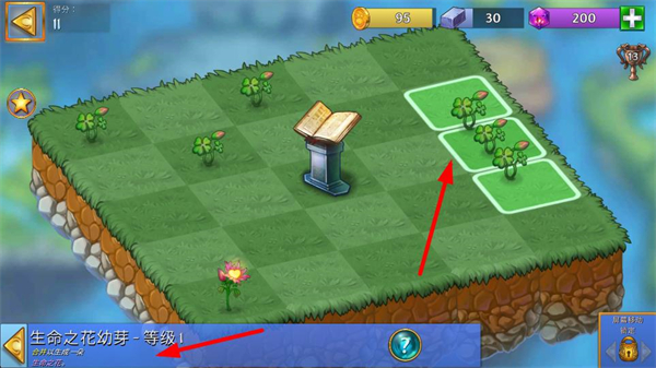1、看到生命之花幼芽等級1,界面顯示金幣石材等資源,將對應植物移到綠色格子,可推進合成進程。