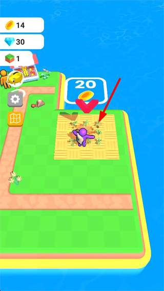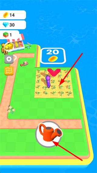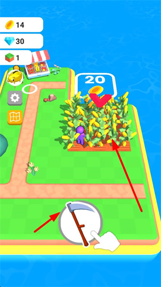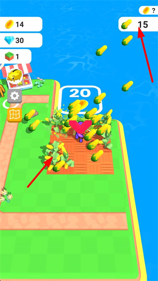 1、操控角色前往種植區域,區域內會顯示待培育的玉米,完成作物培育可獲取對應的資源,比如界面顯示的20金幣獎勵。