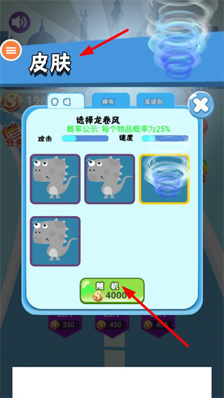 4、進入皮膚界面選擇龍卷風樣式,消耗4000金幣隨機獲取皮膚,每個皮膚概率均等,更換外觀后繼續參與競速。
