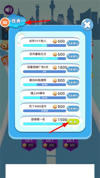 1、在任務界面查看各類目標,如殺死15個敵人或狂飆雷雨五次等,完成對應任務可獲得金幣獎勵,助力游戲進程。