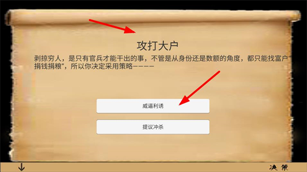 3、進入攻打大戶環節,認為只能向富戶籌錢糧,可選擇威逼利誘的策略,也能選提議沖殺的方式,以此推進獲取糧餉的進程。