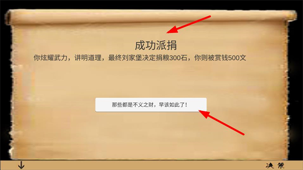 4、若選擇威逼利誘成功派捐,會得到劉家堡捐糧300石的結果,自身也會被賞錢500文,此時可選擇那些都是不義之財早該如此了的選項。