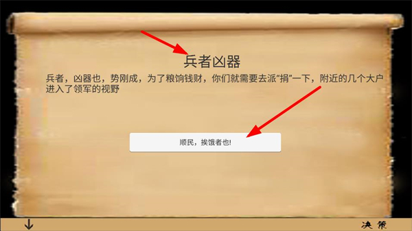 2、若選跟隨義軍,會進入兵者兇器的階段,為籌糧餉錢財,需對附近大戶派捐,此時界面會出現順民挨餓者也的選項供選擇。
