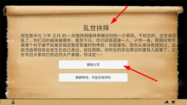 1、處于天元三年正月初一的亂世,作為草民面臨身邊起事的號召,可選擇跟隨義軍參與攻打大戶拿糧,也可選擇靜靜等待盼轉機。