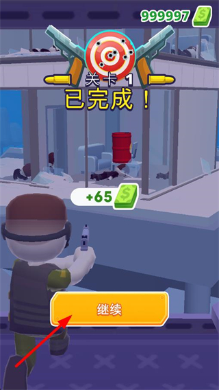 3、關卡1完成后會獲得65金幣獎勵,點擊繼續按鈕,即可進入下一個關卡,開啟新的突襲任務。