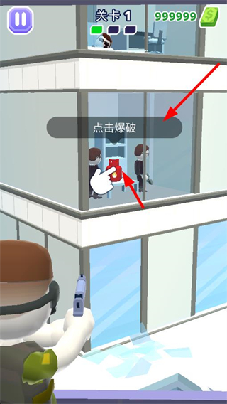 1、看到建筑內的目標與爆破提示,點擊對應區域觸發爆破,借助爆破效果攻擊建筑內的角色,推進關卡流程。