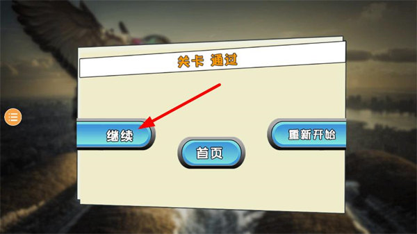 4、關卡通過后彈出提示界面,點擊繼續按鈕,進入下一個關卡繼續進行飛鷹的城市穿梭挑戰。