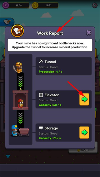 3、查看工作報告界面,能了解礦井各設施的狀態,點擊對應設施旁的升級按鈕,可提升設施性能,消除生產瓶頸。