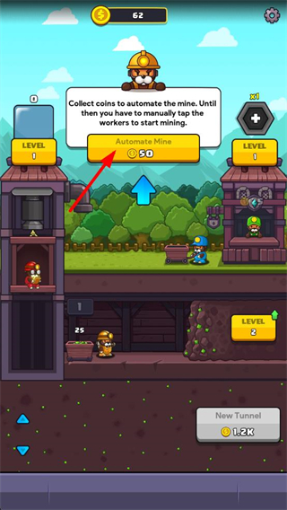 1、積累足夠金幣后,點擊自動采礦按鈕可開啟礦井自動采礦功能,開啟后無需手動操作礦工,礦工會自主進行采礦,推進資源積累。