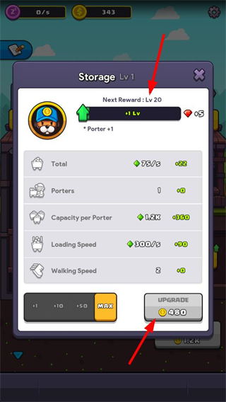 4、進入存儲界面,查看存儲相關數據,消耗資源點擊升級按鈕,可升級存儲屬性,增加搬運工數量或提升存儲效率。