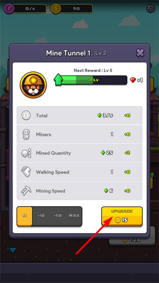 2、打開采礦隧道界面,查看當前采礦隧道的等級與數據,消耗金幣點擊升級按鈕,可升級隧道等級,提升采礦相關屬性。