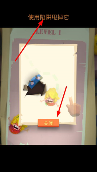 2、查看使用陷阱電掉它的提示,利用場景內的陷阱道具攻擊積木怪,成功后點擊關閉按鈕,繼續推進當前關卡的進程。