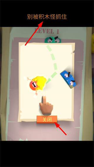 1、出現別被積木怪抓住的提示,操控角色躲避積木怪的追擊,完成指引后點擊關閉按鈕,推進關卡流程。