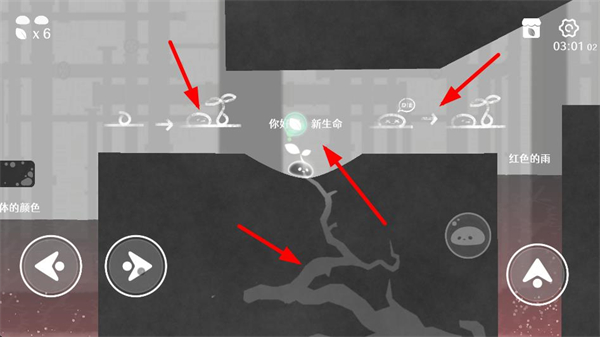 2、遇到新生命相關提示,界面顯示形態變化的指引,跟隨指引探索場景,同時注意紅色的雨等環境元素,繼續推進生存冒險。
