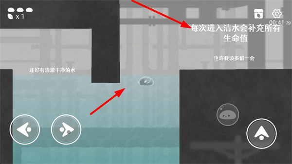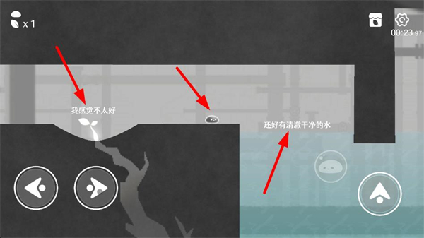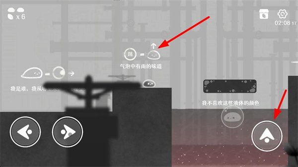 1、操控水精靈移動,界面有方向和跳躍按鈕,根據提示了解氣泡和液體相關信息,避開不喜的液體,借助跳躍按鈕跨越障礙推進流程。