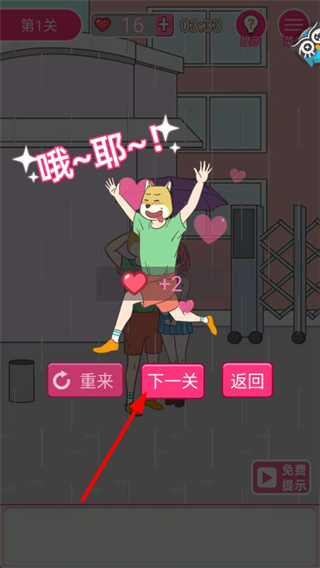 4、完成當前關卡互動后,獲得愛心獎勵,點擊下一關按鈕進入新關卡,繼續進行角色互動挑戰。