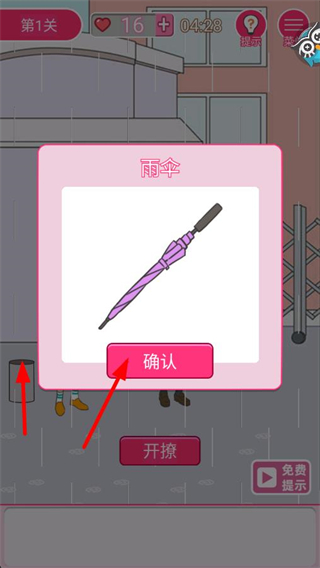 2、在關卡界面里獲取雨傘道具,點擊確認按鈕領取,借助該道具推進與場景角色的互動,提升互動進度。