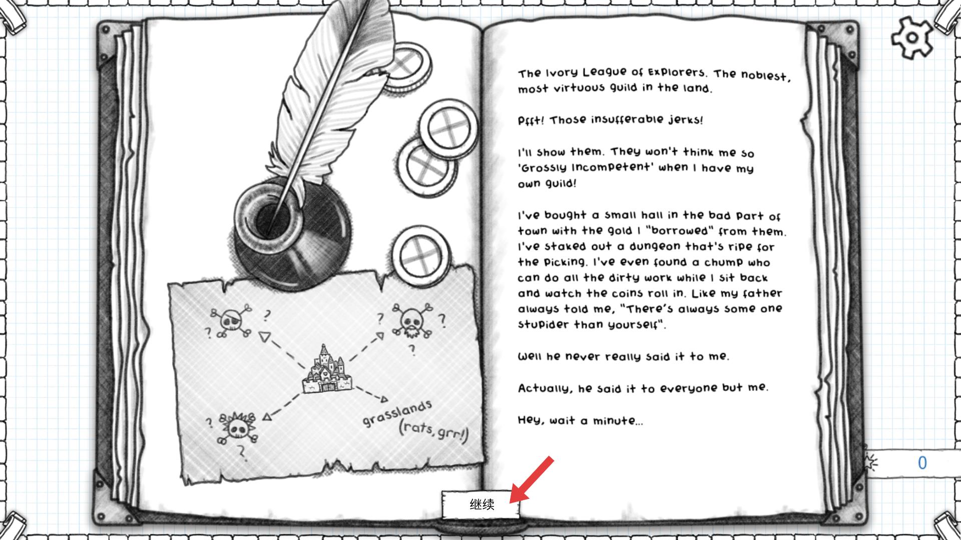 2、進入游戲劇情界面,點擊繼續,查看關于地下城公會的故事,了解背景設定,為后續建造和冒險做好鋪墊。