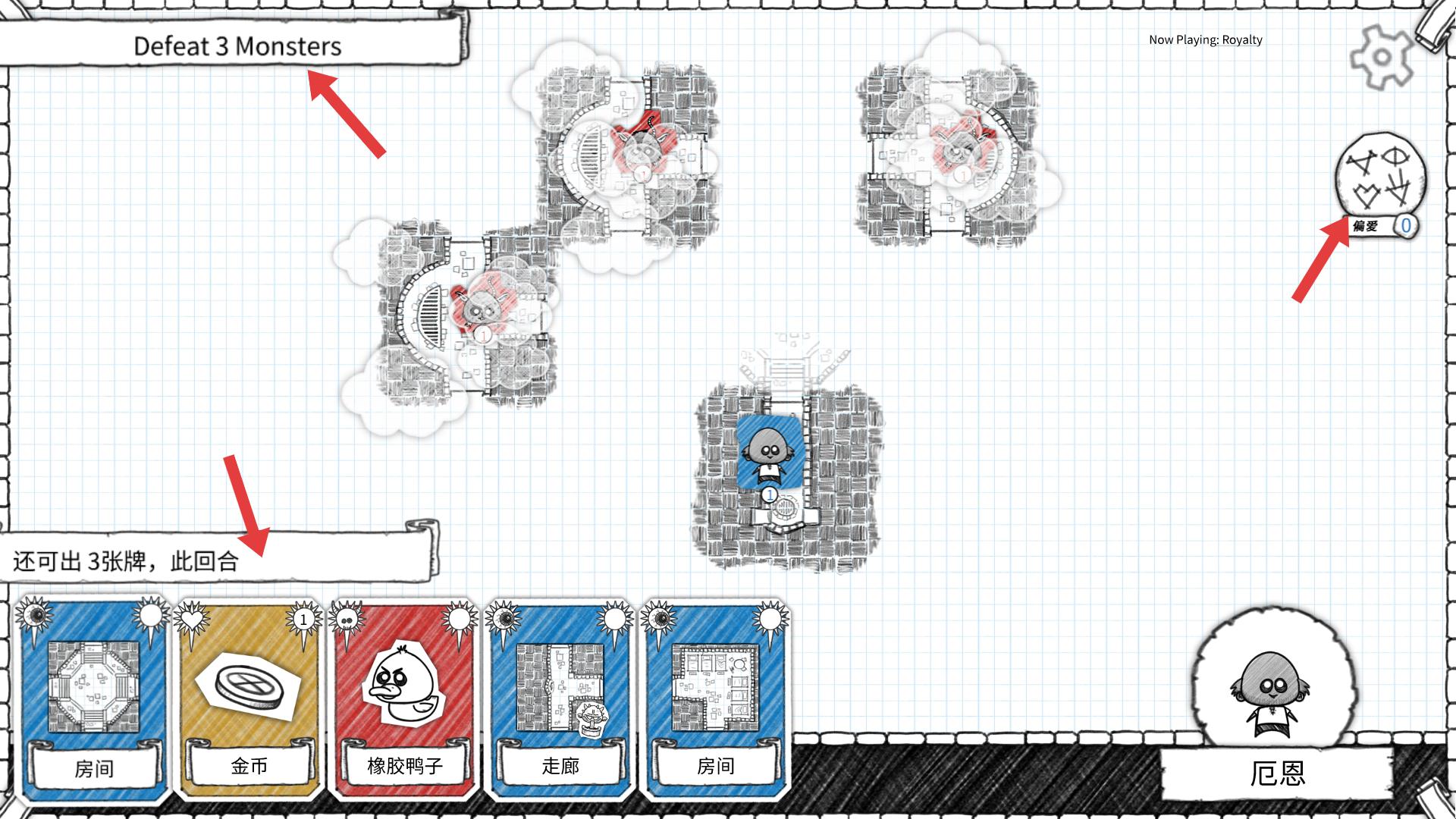 4、進入戰斗關卡,目標是擊敗3只怪物,利用手牌,合理打出房間、金幣等卡牌,規劃地下城布局,助力勇士戰斗,完成關卡任務。