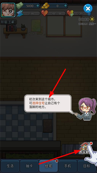 1、看到提示初次來到城市可選擇住宅落腳,界面底部有住宅選項,點擊購買新房按鈕,就能進入購房相關操作界面。