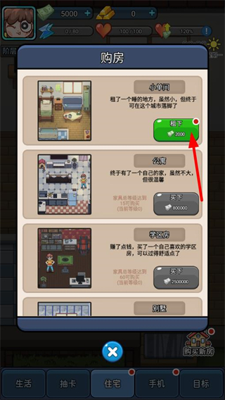 2、進入購房界面后看到小單間公寓等住宅類型,小單間可花費2000租用,公寓等則需滿足家具等級條件才能買下,選擇對應按鈕完成操作。