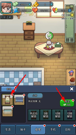 3、成功入住后進入住宅界面,可在臥室分類下選擇家具,比如花費500購買小床,購買后還能解鎖對應等級的相關內容,豐富住宅布置。