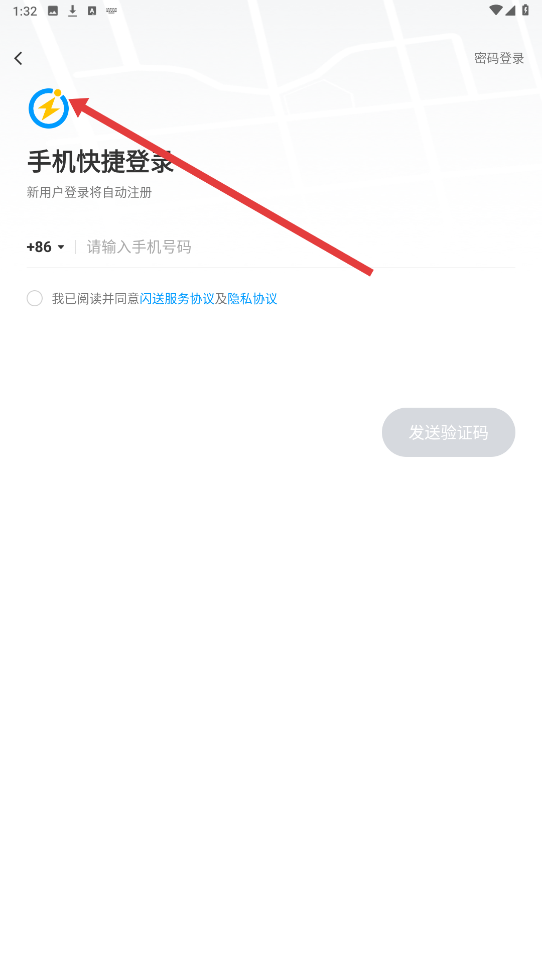1、進入閃送登錄界面,可選擇手機快捷登錄,輸入手機號碼并獲取驗證碼,閱讀并同意服務協議及隱私協議后即可登錄,新用戶登錄將自動注冊。