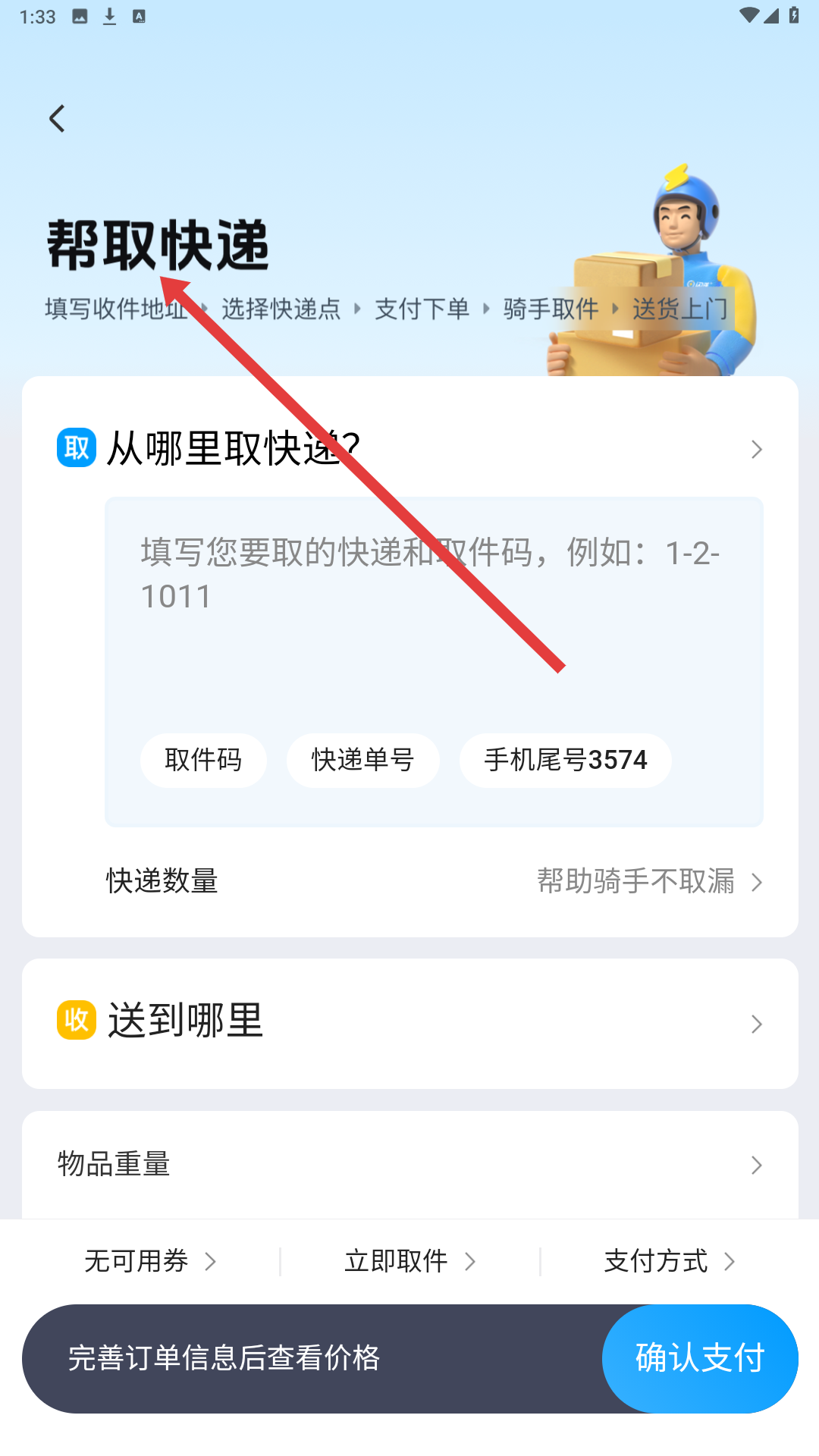 4、幫取快遞頁面,需填寫取件地址、取件碼或快遞單號等信息,以及收件地址、物品重量等內容,完善信息后可確認支付完成下單。