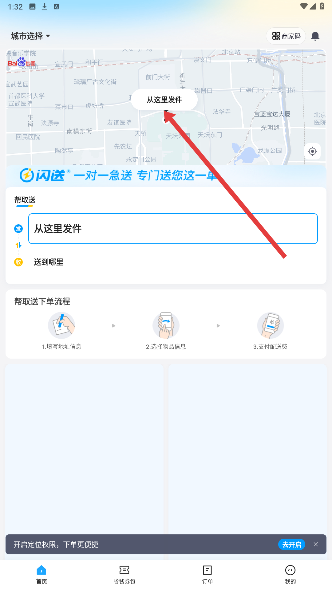 2、登錄后進入閃送首頁,可選擇發件地址,界面顯示地圖及發件、收件地址填寫區域,還可查看幫取送下單流程。