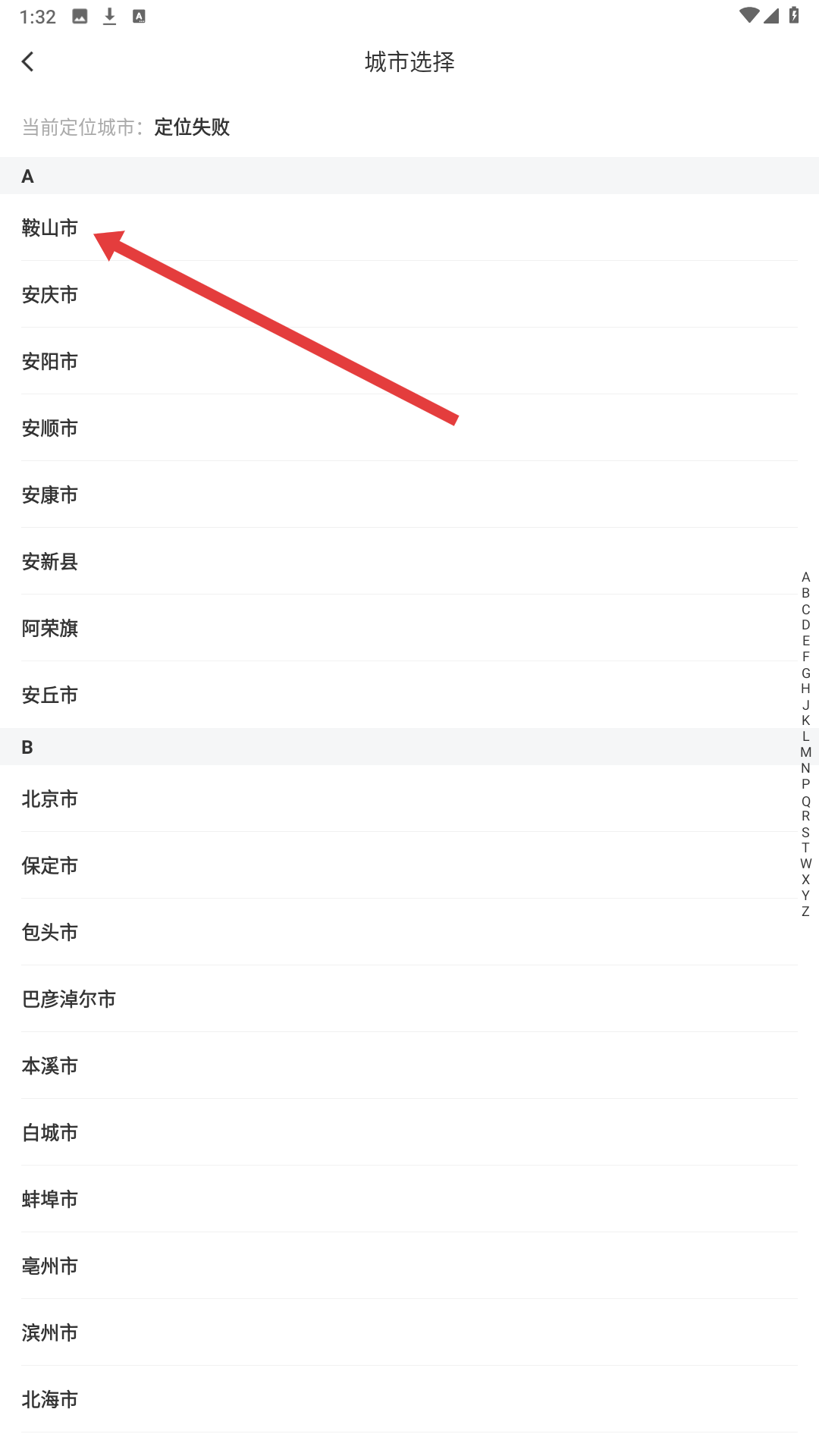 3、城市選擇頁面,可從按字母排序的城市列表中選擇所在城市,方便設置服務的城市范圍。