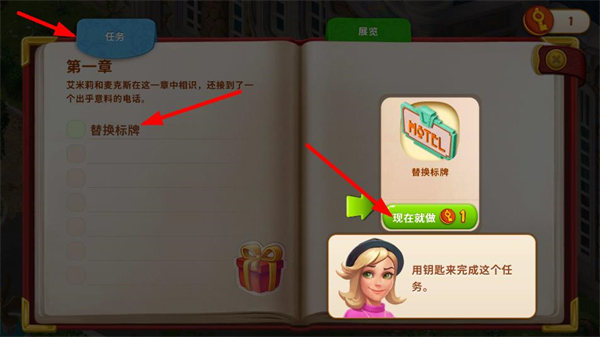 1、查看任務界面,選擇替換標牌任務,點擊現在就做消耗鑰匙,開啟對應的任務流程,推進章節進度。