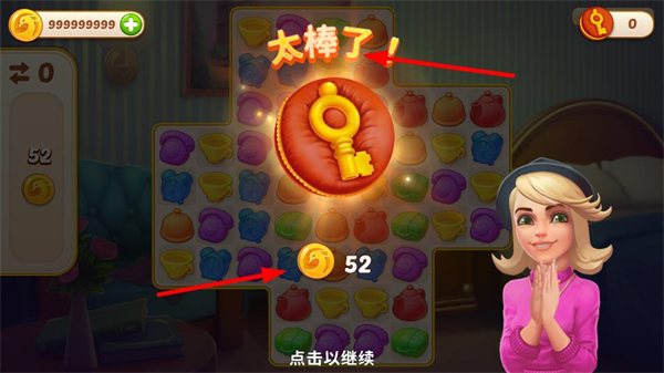 4、完成消除關卡后會顯示太棒了的提示,獲取對應的金幣獎勵,點擊繼續按鈕可推進后續的游戲流程。