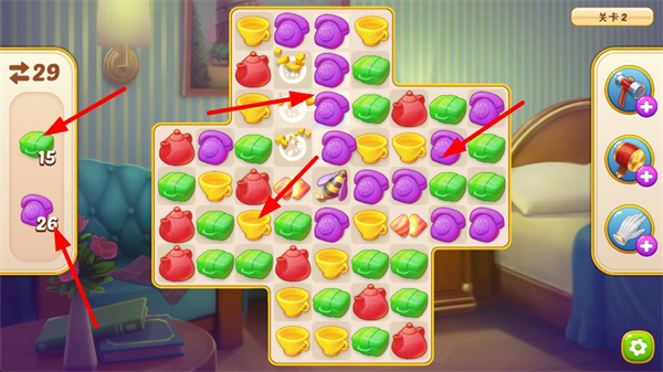 3、進入消除關卡,通過消除相同物品比如綠色方塊紫色電話等,積累對應的數量,完成關卡的消除目標。
