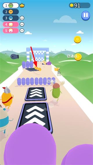 3、進入新賽道,賽道上有加速道具和已通過標識,操控角色拾取道具,借助道具提升移動速度,同時收集賽道上的金幣增加收益。