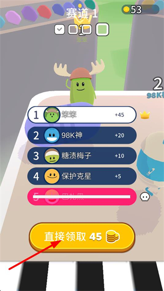 2、完成賽道1賽程后,界面顯示排名及對應獎勵,自身排名第一可獲得45金幣,點擊直接領取按鈕就能獲取對應的金幣獎勵。