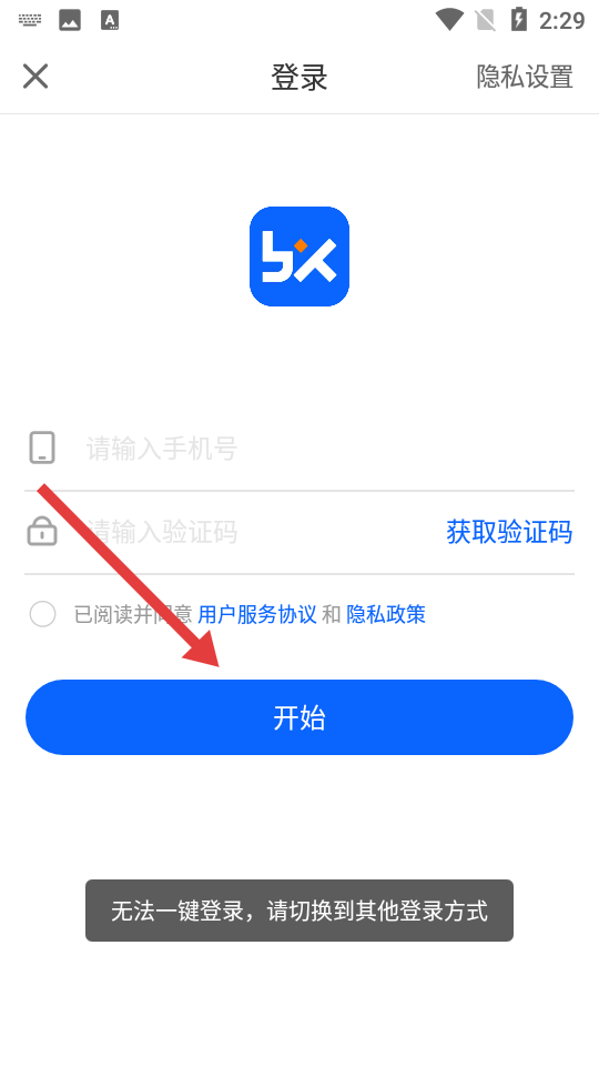 1、登錄界面上方有隱私設置選項,需輸入手機號和驗證碼,閱讀并同意相關協議后點擊開始登錄。