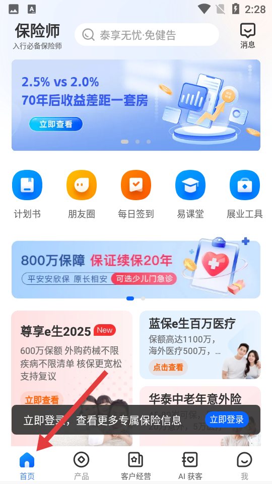 2、首頁有泰享無憂免健告搜索欄和消息圖標,展示了計劃書、朋友圈、每日簽到等功能入口還有保險產品推薦。