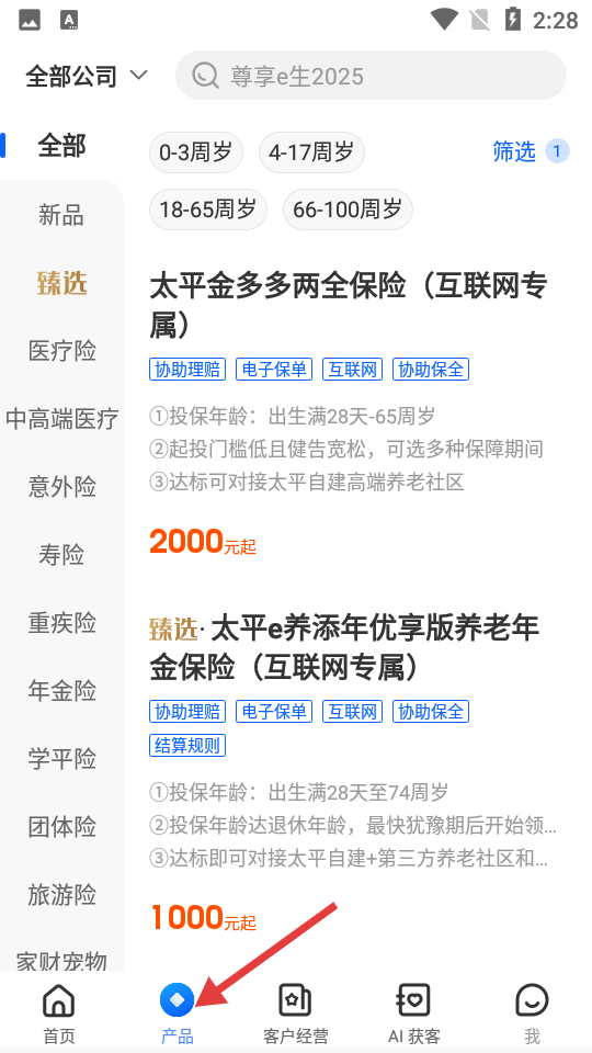 3、產品頁面頂部可篩選公司和產品,按年齡分類展示了如太平金多多兩全保險等多種保險產品及其簡要信息。