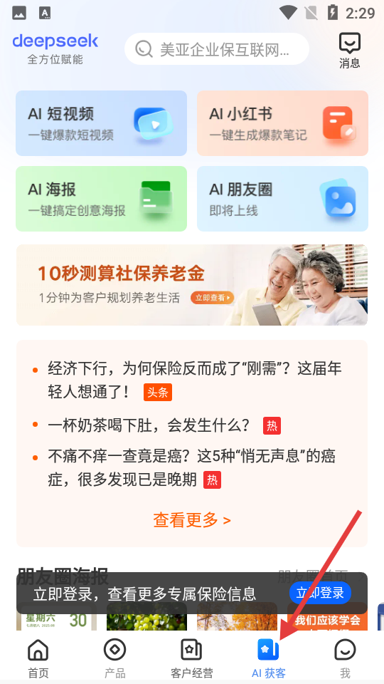 4、AI獲客頁面含AI短視頻等功能,能快速測算社保養老金,推送保險及健康熱點資訊,助力保險從業者獲客。