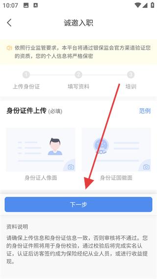 4、在入職資料上傳頁面上傳身份證件的人像面和國徽面,確保信息準確然后點擊下一步,繼續完成后續入職流程。