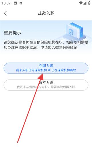 2、在誠邀入職頁面看到重要提示和立即入職,暫不入職選項,若符合入職條件,點擊立即入職,進入加入微易經紀的權益展示頁面。