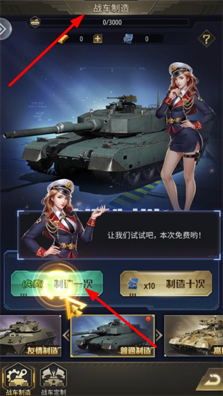 1、可制造戰車,點擊制造一次或制造十次獲取坦克,增強軍團戰力,助力坦克對戰,推進游戲進程。