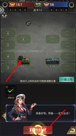 2、布置坦克陣型,調整坦克位置,點擊開始戰斗,通過策略布陣提升戰力,擊敗敵方坦克。