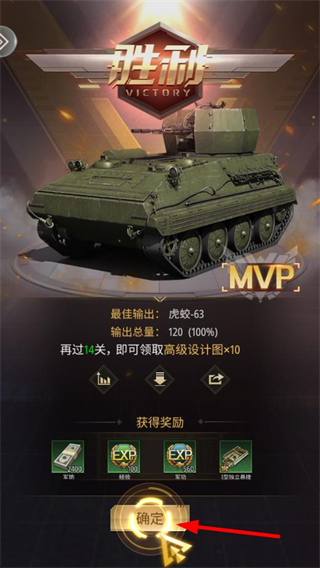 3、戰斗勝利后點擊確定領取獎勵,獲取金幣、經驗等資源,提升坦克等級,解鎖新坦克和游戲內容。