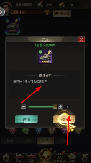 4、可收集坦克碎片,如螢火蟲碎片,湊齊30個可合成該戰車,增強軍團實力,助力坦克軍團戰。