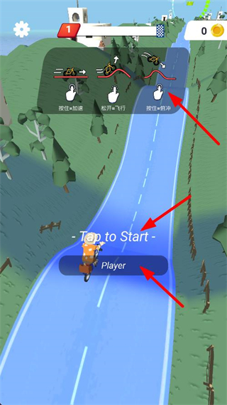 1、按照提示操作,按住加速、松開飛行、按住沖刺,點擊開始按鈕,開啟自行車競速挑戰。