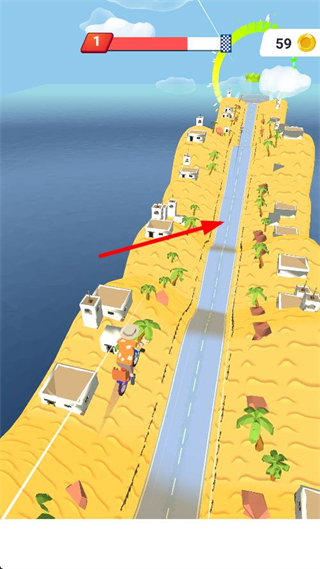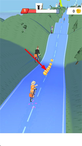 2、競速的過程,操控自行車收集道路上的金幣,提升資源收益,同時超越其他選手,推進比賽進度。