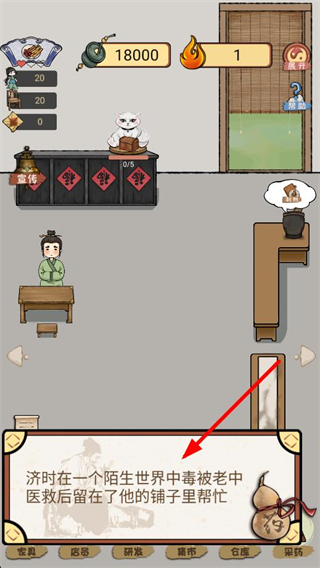 1、濟時在陌生世界中毒被老中醫救后,留在鋪子里幫忙,開啟經營中醫鋪的旅程,可進行宣傳等操作。